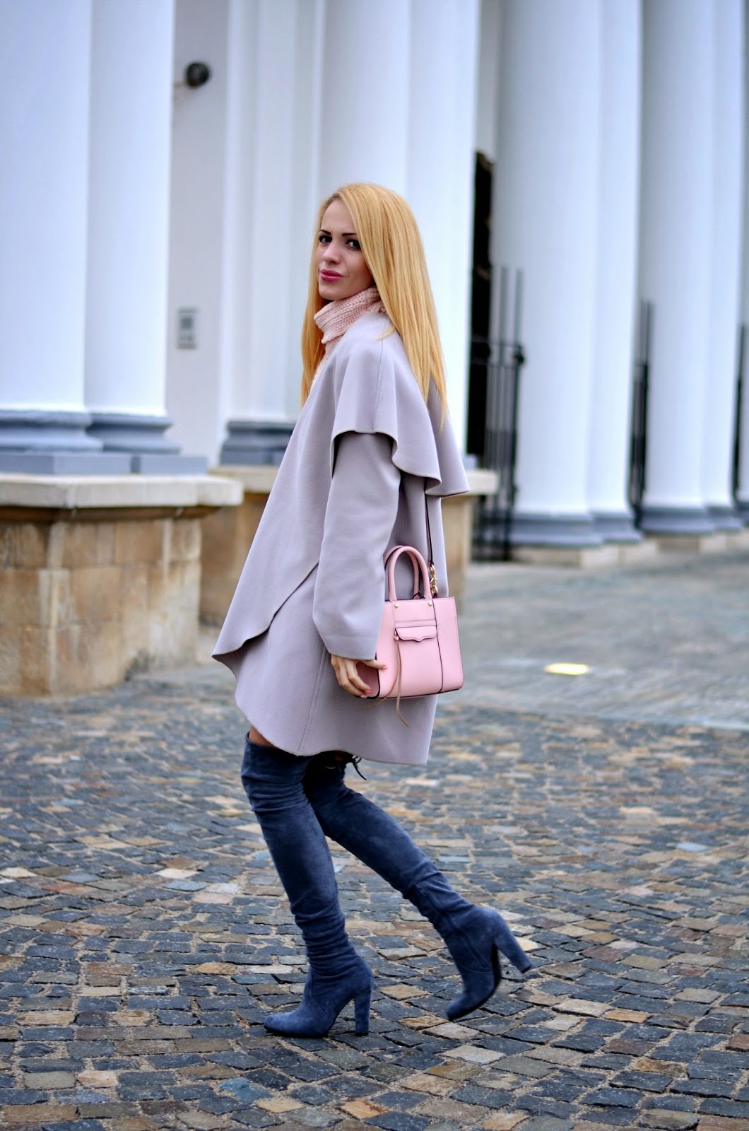 Today I want to show you a girly outfit, composed of a mini black skirt, grey coat and over the knee boots and a pink sweater and bag.