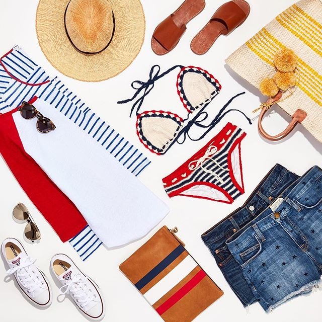 SUNGLASSES / DENIM SHORTS / T-SHIRT / CLUTCH / CONVERSE / SANDALS / SWIMWEAR / BEACH BAG